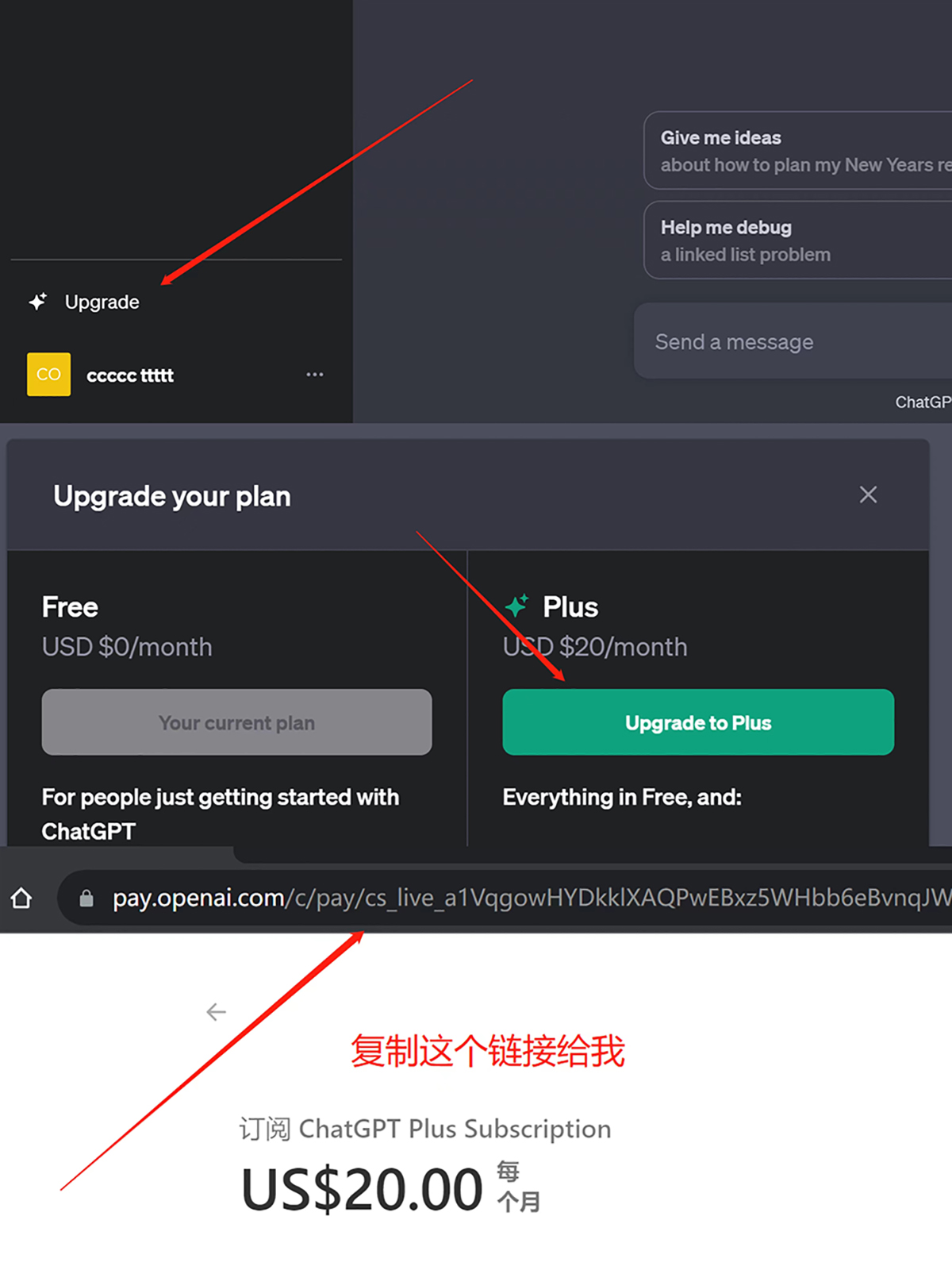 直接发PLUS付款链接过来,登录自己的ChatGPT账号,然后点击找【upgrade】,然后点击【upgrade plan】,跳转到付费界面,讲该页面的链接复制完整